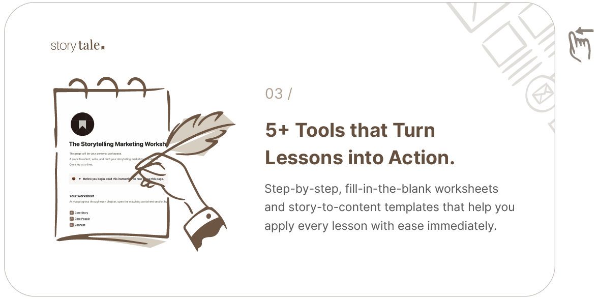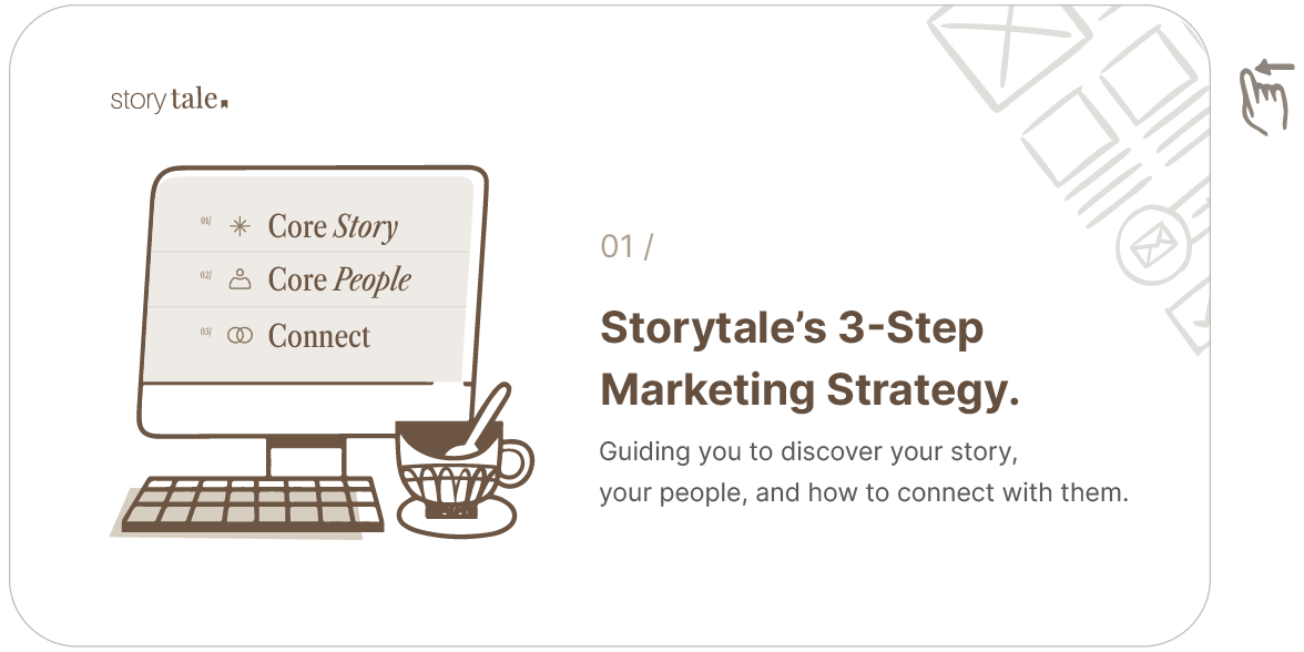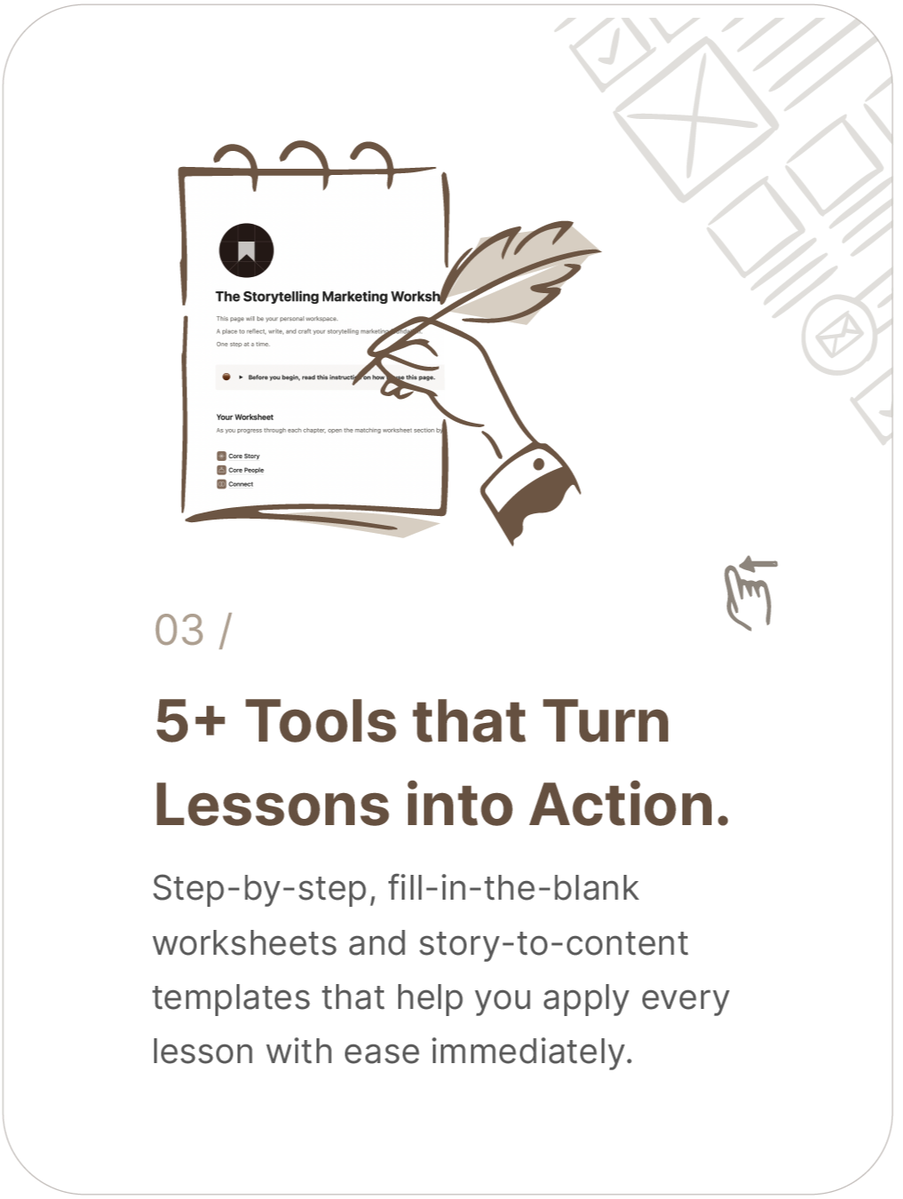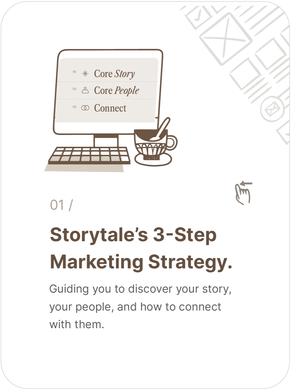 🔸 Here, we start within. You’ll go through our 3-step framework to uncover the missing piece of your marketing: your story.