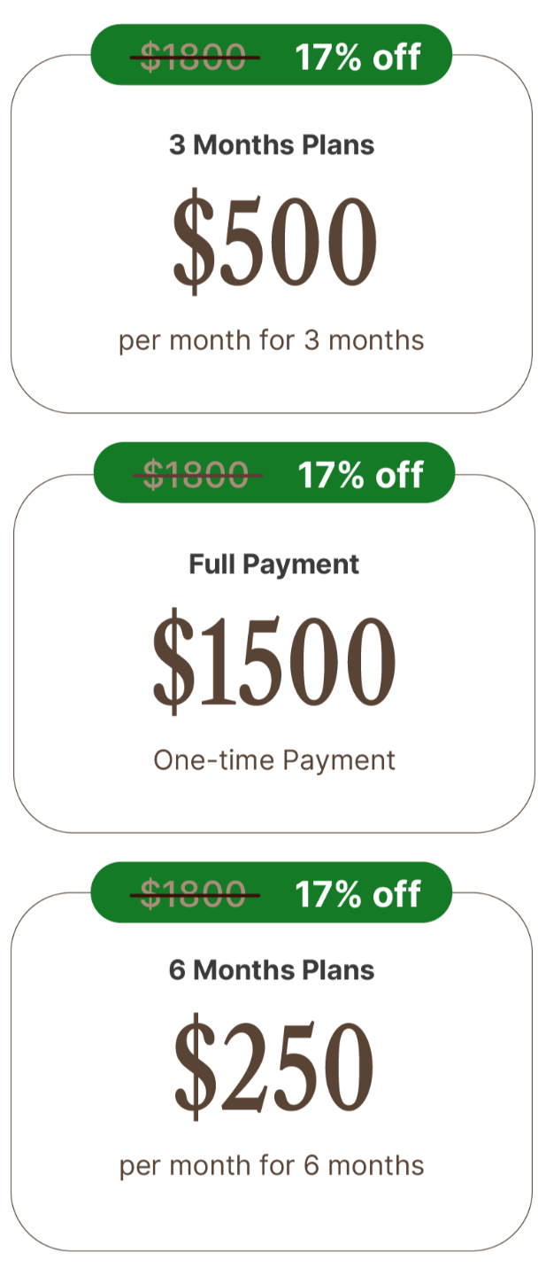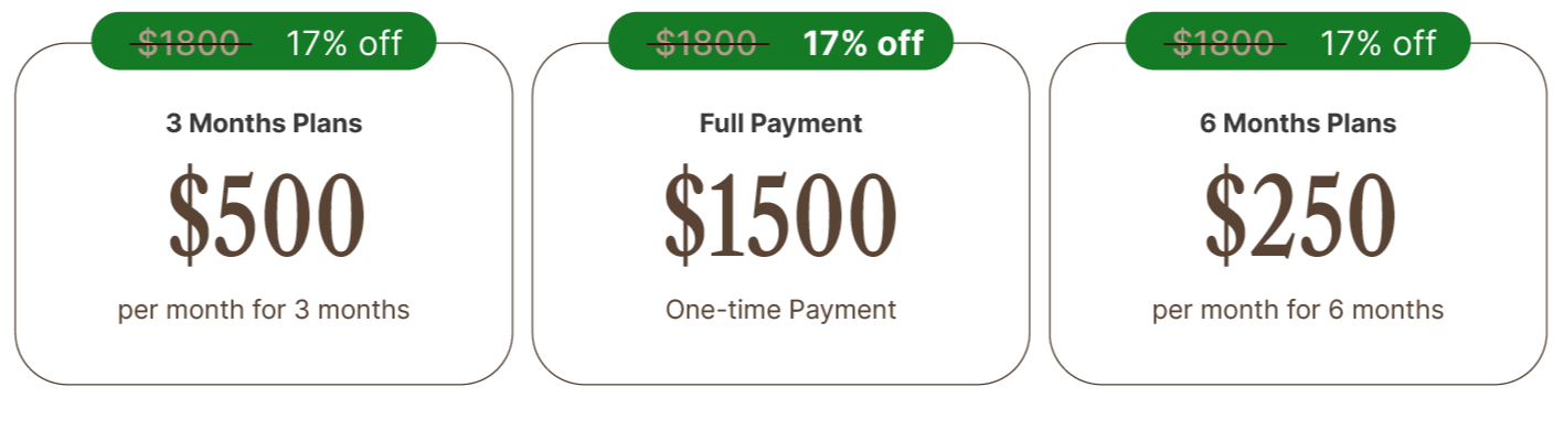 You can choose between full payment, a 3-month or a 6-month plan (with upfront fee).