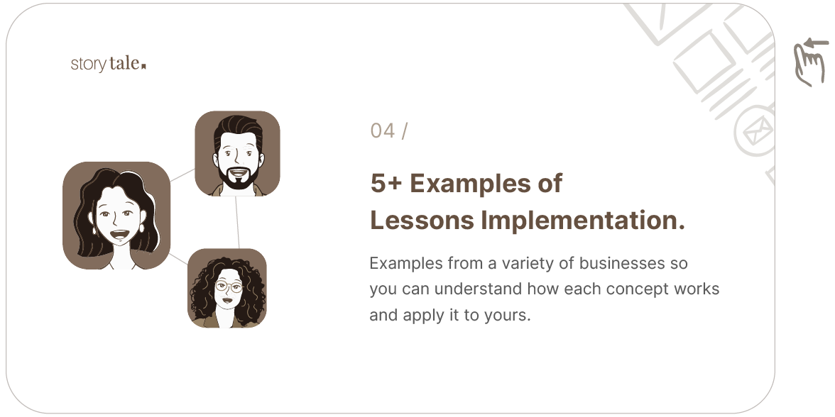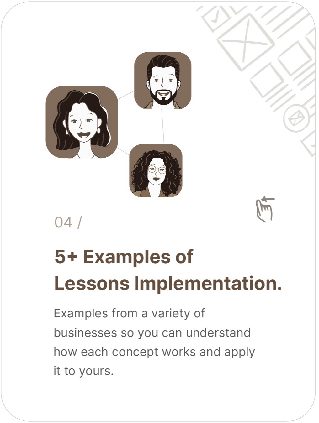 🔸 At the end of every chapter (and sub-chapter), you’ll see examples from different types of businesses. So you’ll understand what a Core Story, Core People, or Connect actually looks like and visualize your own.