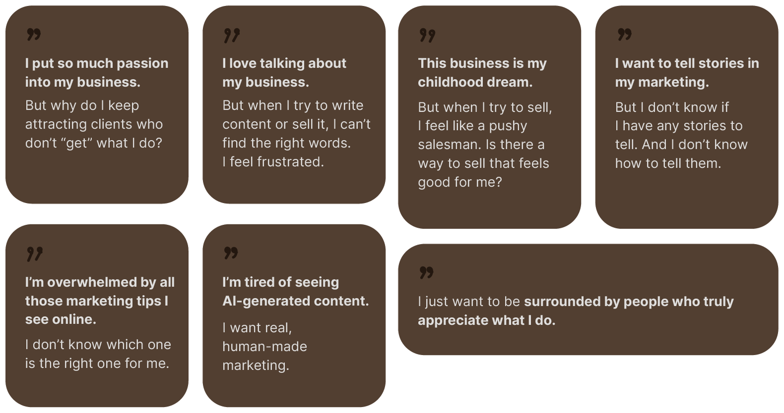 🔸 Here, we start within. You’ll go through our 3-step framework to uncover the missing piece of your marketing: your story.